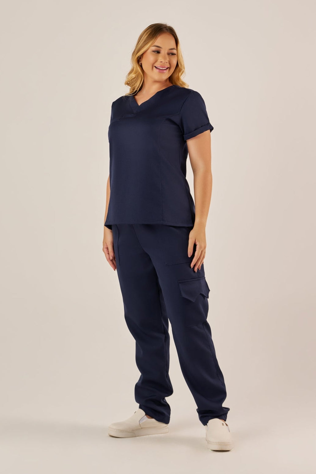 Confeccionado em crepe alfaiataria (95% poliéster e 5% elastano), o Scrub Lucy combina durabilidade, caimento confortável e toque suave, ideal para quem precisa de estilo e praticidade na rotina profissional.