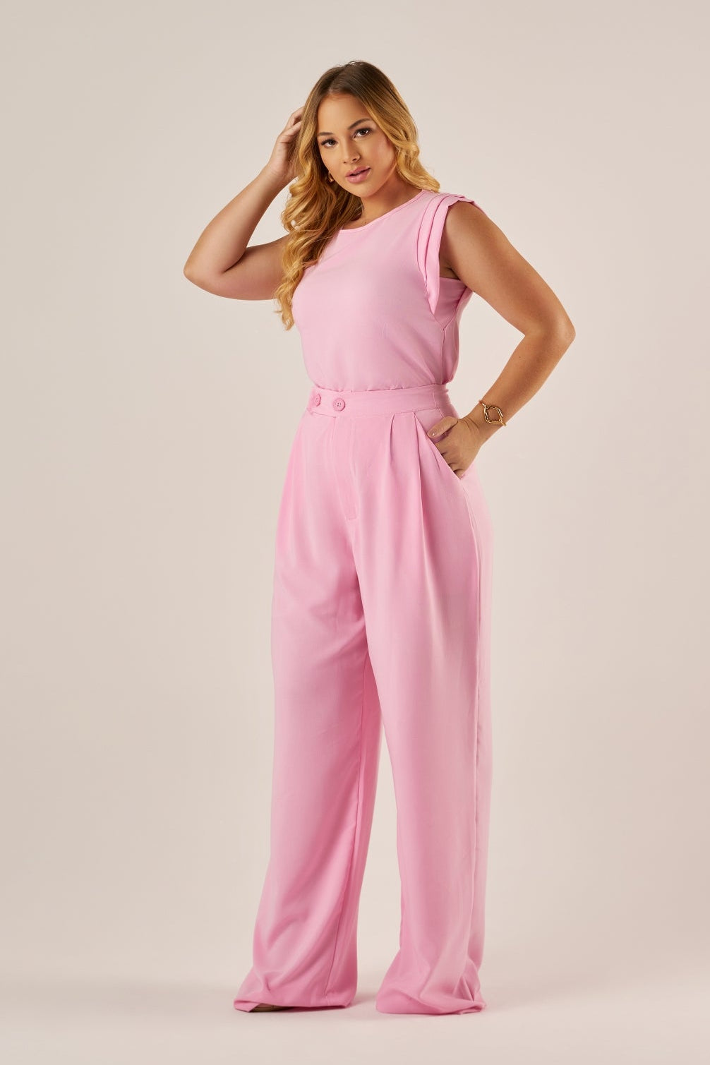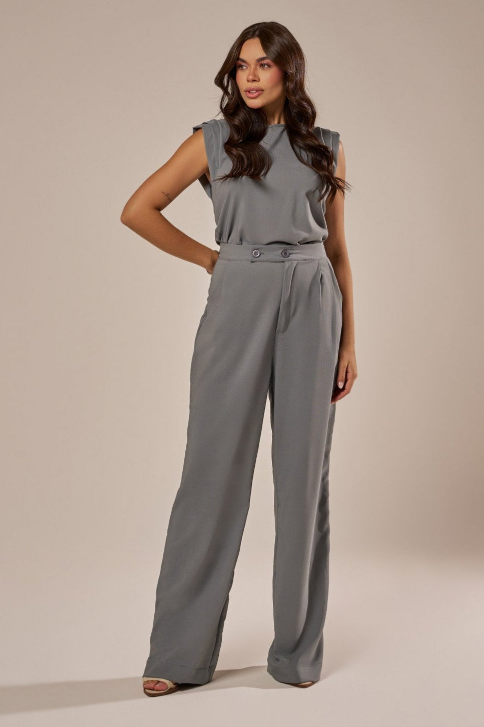 Calça: modelagem pantalona, ajustada na cintura e fluida nas pernas, trazendo movimento e imponência ao look. Possui fechamento em zíper e botões duplos para um acabamento refinado, além de bolsos laterais funcionais.